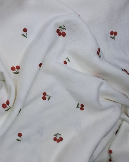 Kích thước sợi: 40s*40s Mật độ sợi: 233TC Trọng lượng: 140 g/m² Màu sắc: họa tiết trắng quả cherry hiện đại Hoạ tiết: quả cherry Khổ vải: 2,4 m |